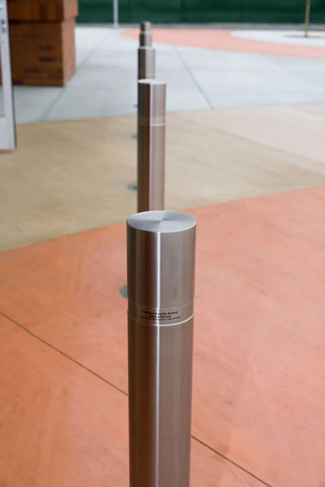 The R-8460 Stainless Steel Bollard can be embedded in concrete for simple and secure installations. Its clean and versatile design is highly visible and available with alternative mountings (see retractable and removable models) for consistent aesthetics that suit any modern building or landscape. High-quality 316 grade stainless steel with #6 satin finish features high resistance to corrosion and weathering. Posts ship standard with 1 of 4 colored reflector stripes.